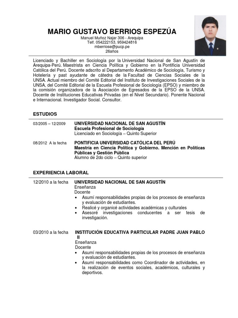 Currículum Vitae Ejemplos Peru : Cv) es el conjunto de estudios, méritos, cargos, premios.